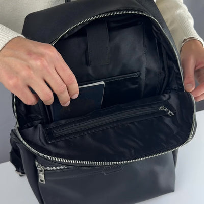 The Salerno backpack is crafted for the modern traveler. Its compact design features shortened shoulder straps for a secure fit, while the padded laptop compartment keeps your device protected. Thoughtfully placed small pockets keep your wallet, passport and essentials neatly organised and easily accessible. A breathable back panel promotes airflow, and the rear strap slides over your suitcase handle for effortless airport navigation.